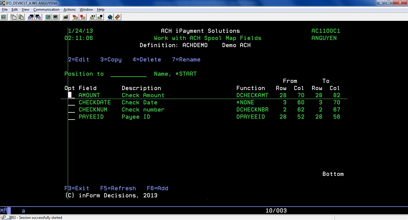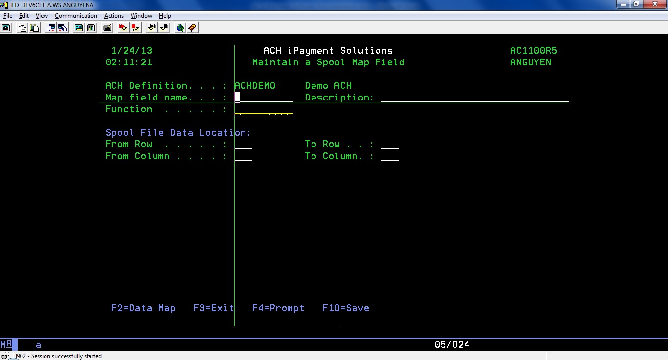 From screen ‘Work with ACH Definitions’ (AC1000C1), select option 8=Work with Spool map fields to work with spool mapped fields, or from screen ‘Maintain an ACH Definition’ (AC1000R5), press F8=Work w/ Spool Map Fields.