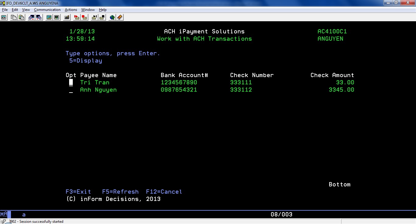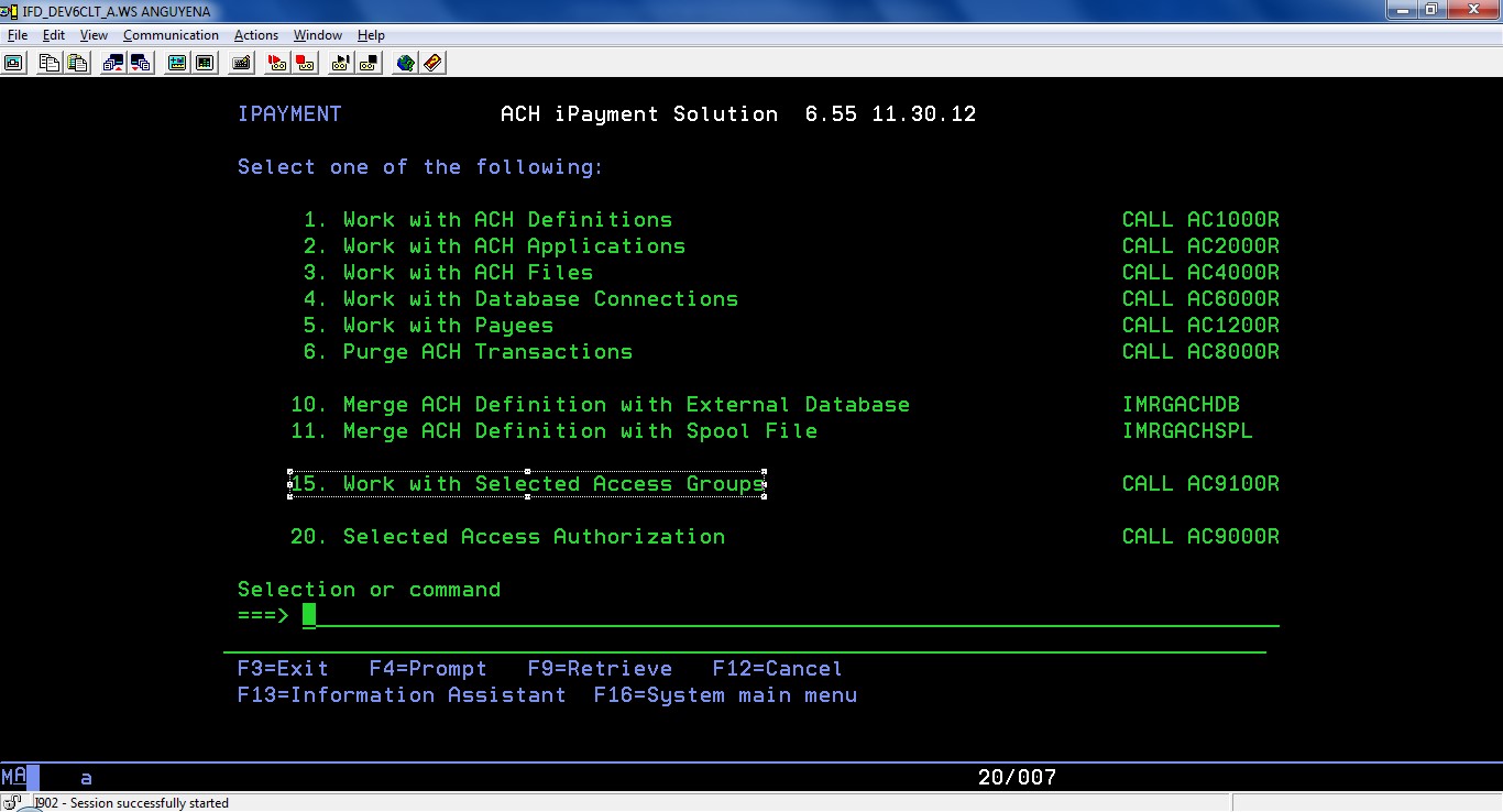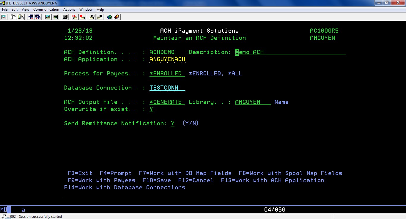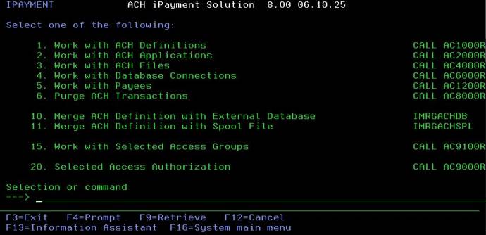 Select option 1 from iPayment main menu to see the existing ACH definitions or to create a new ACH definition.