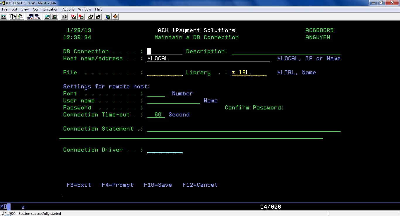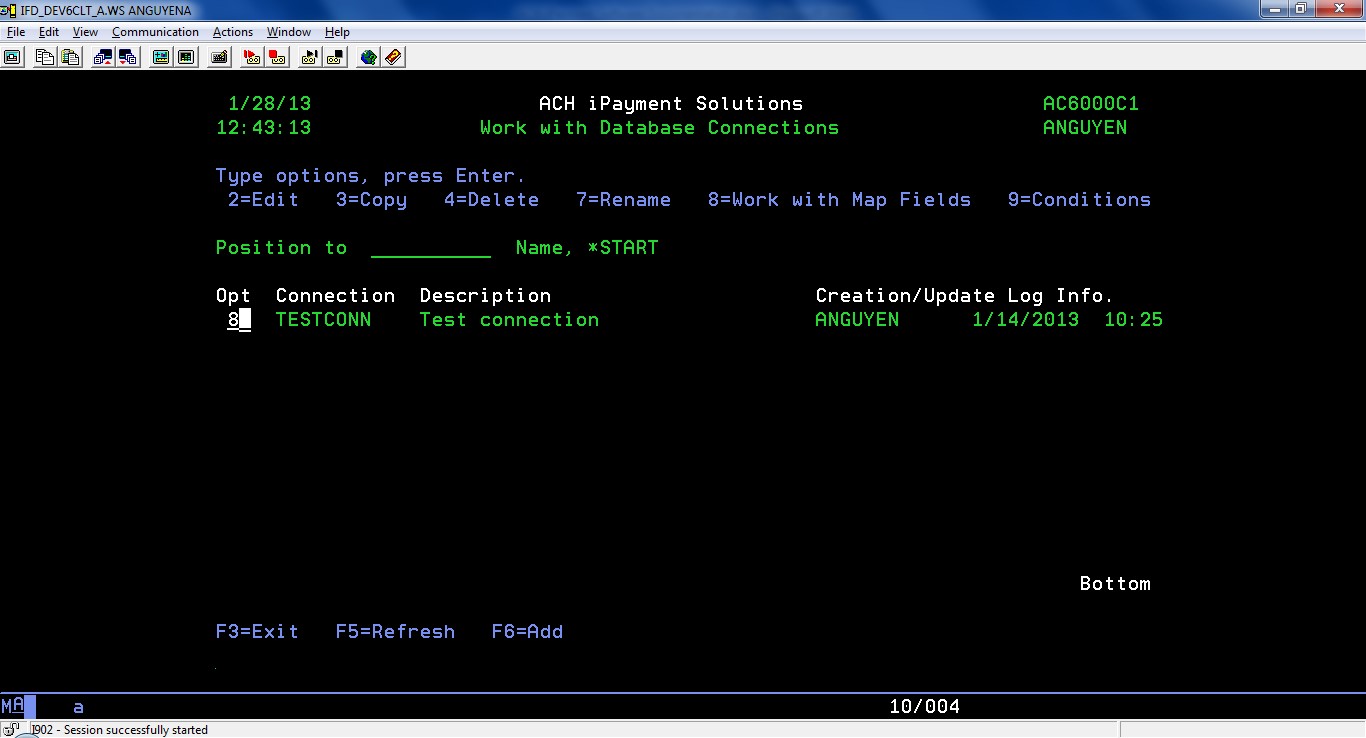 In order to work with Database Connections, select menu item 4. Work with Database Connections from iPayment menu.