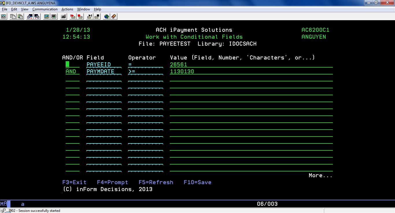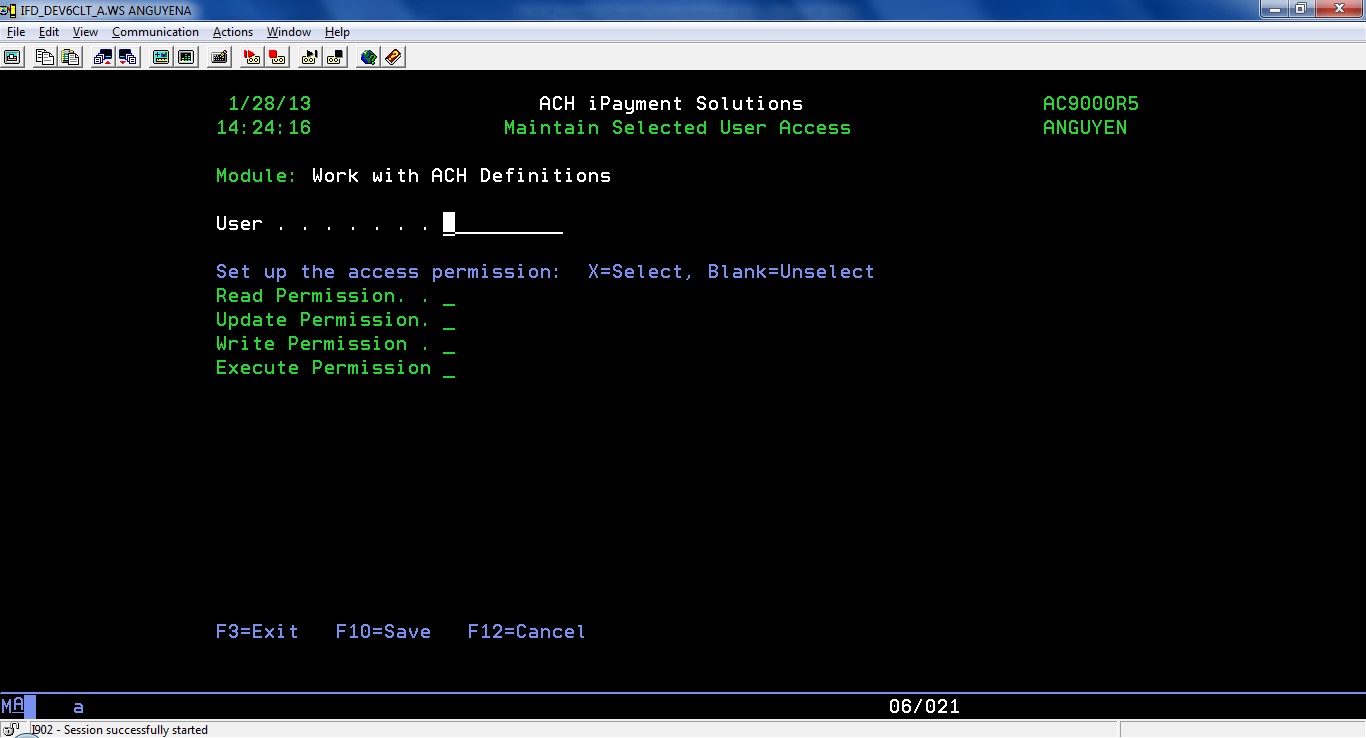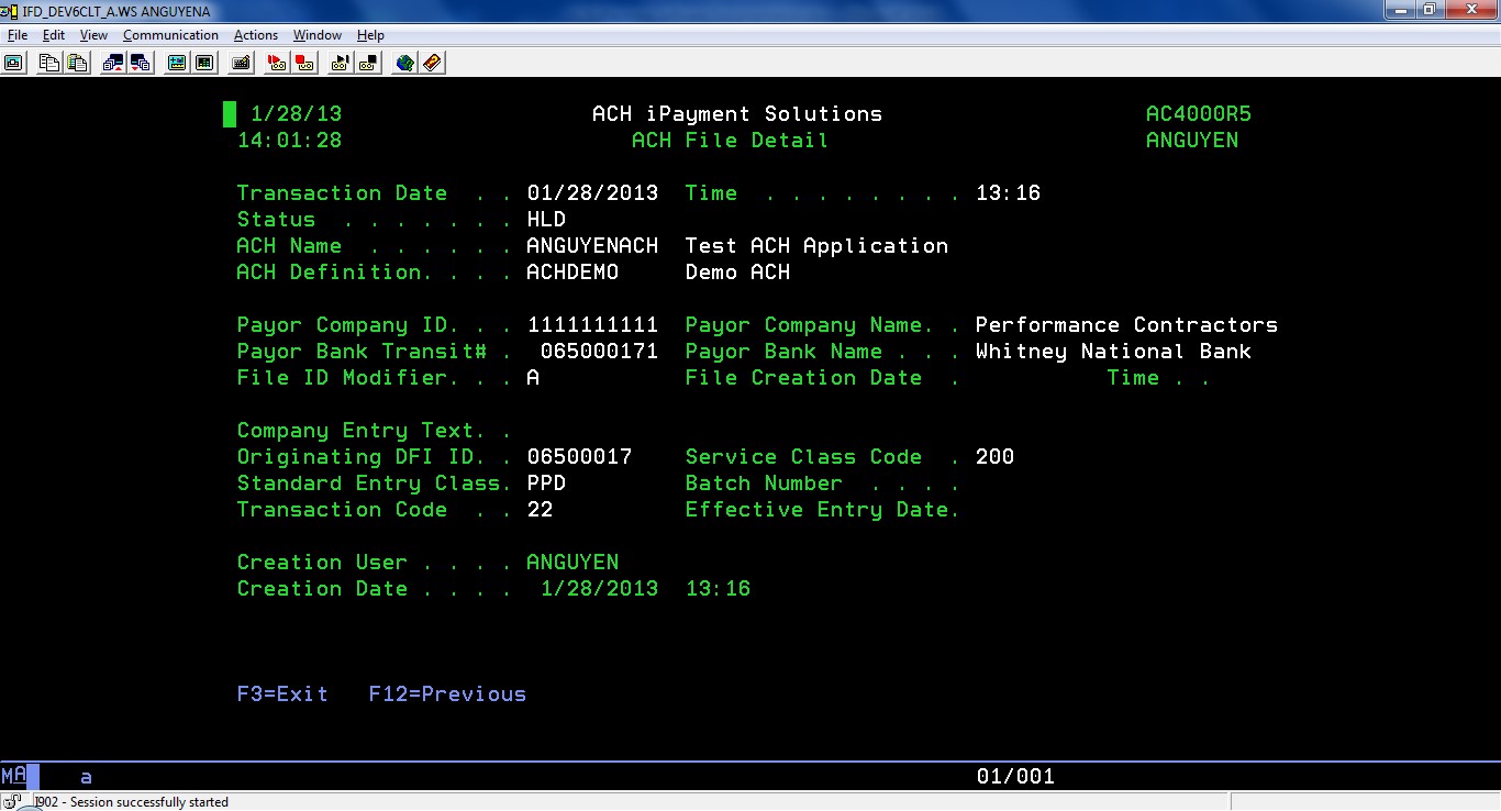 | F6 | Add | Create a new ACH application entry |