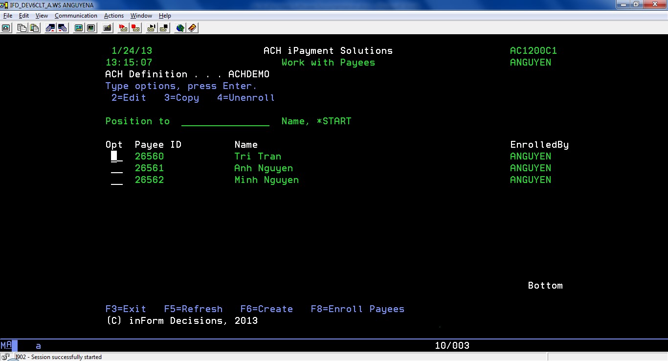 In order to enroll the payees into ACH definition, select option 12=Work with Payees from screen Work with ACH Definitions (AC1000C1) or press F9=Work w/ Payees from screen Maintain an ACH Definition (AC1000R5)