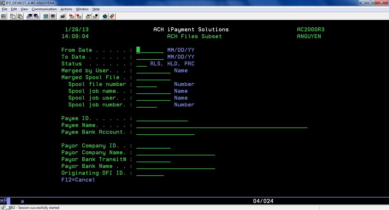 From iPayment menu, select item 3. Work with ACH Files.