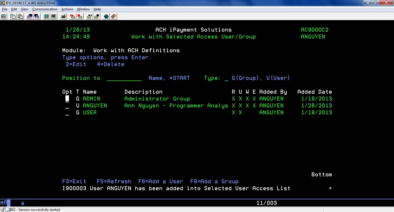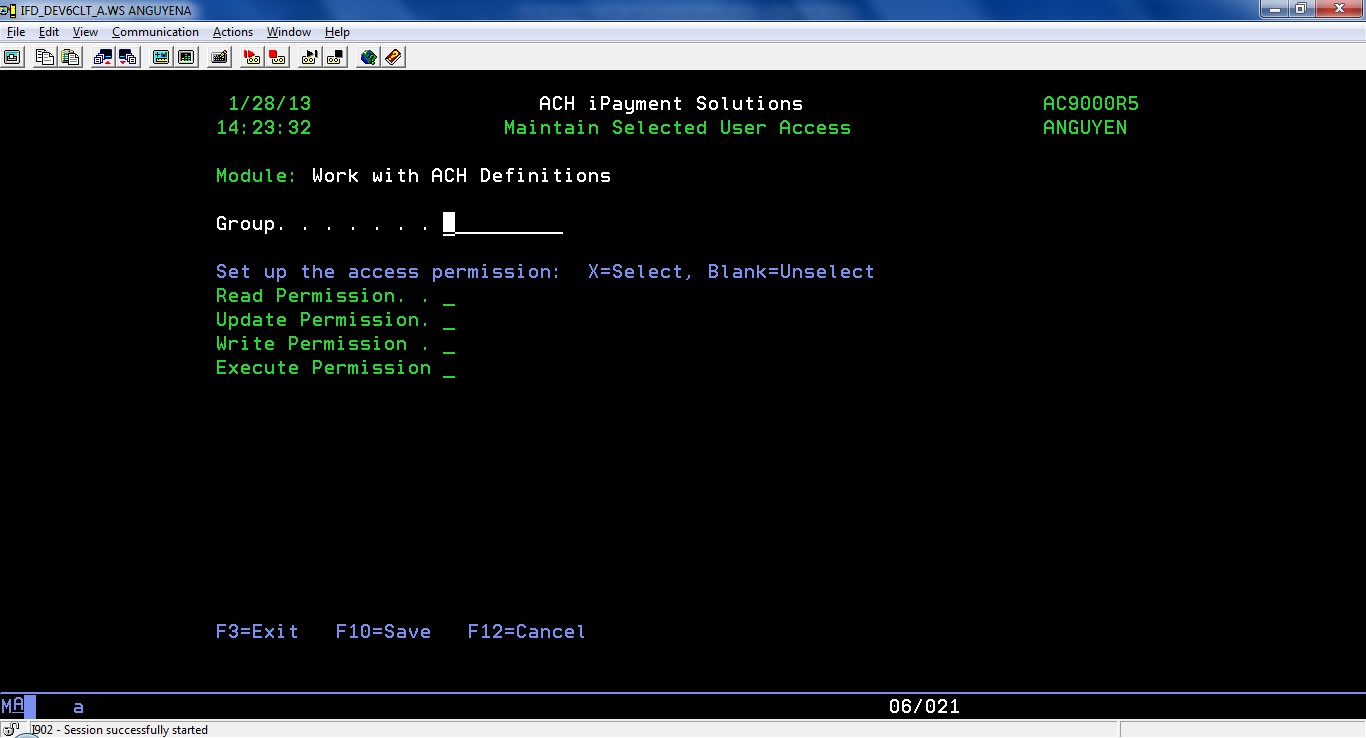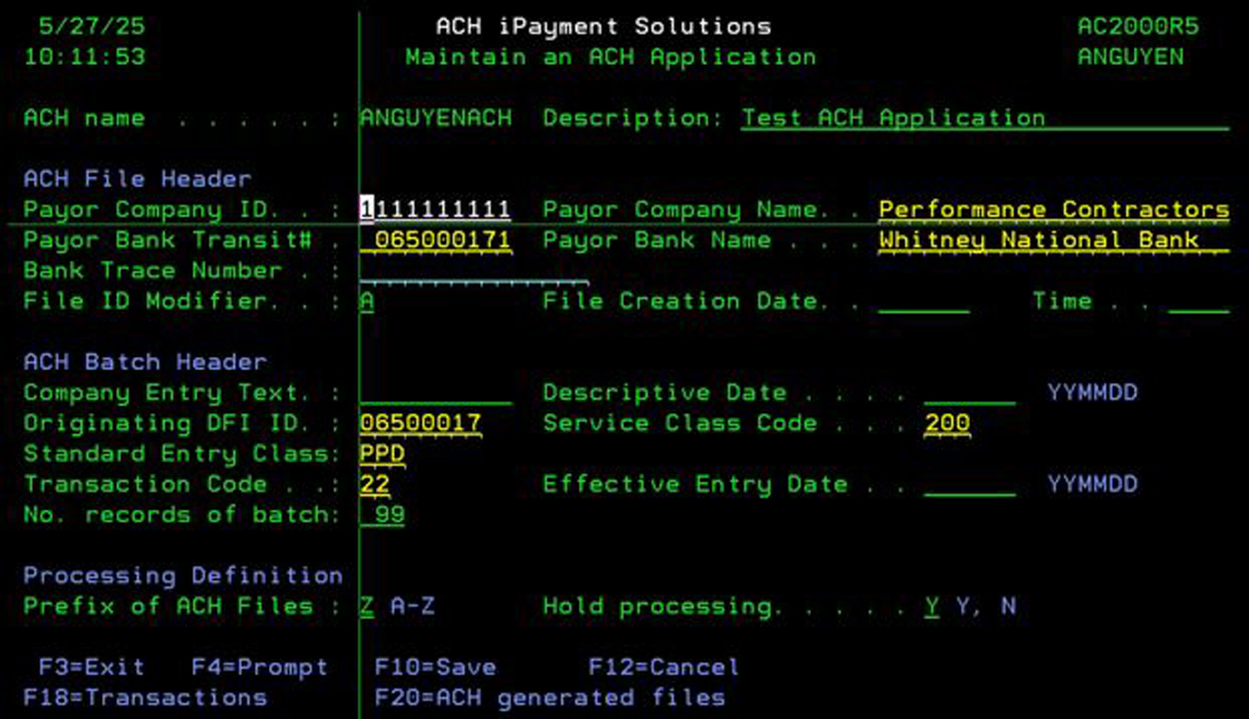 To create the ACH definition, press F6=Add: