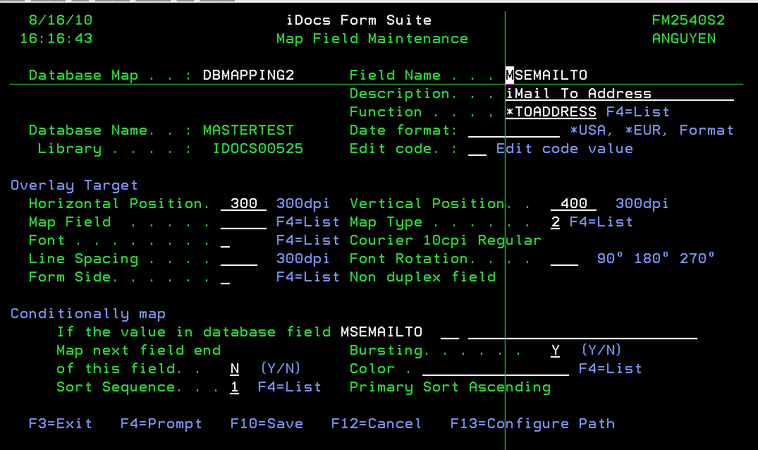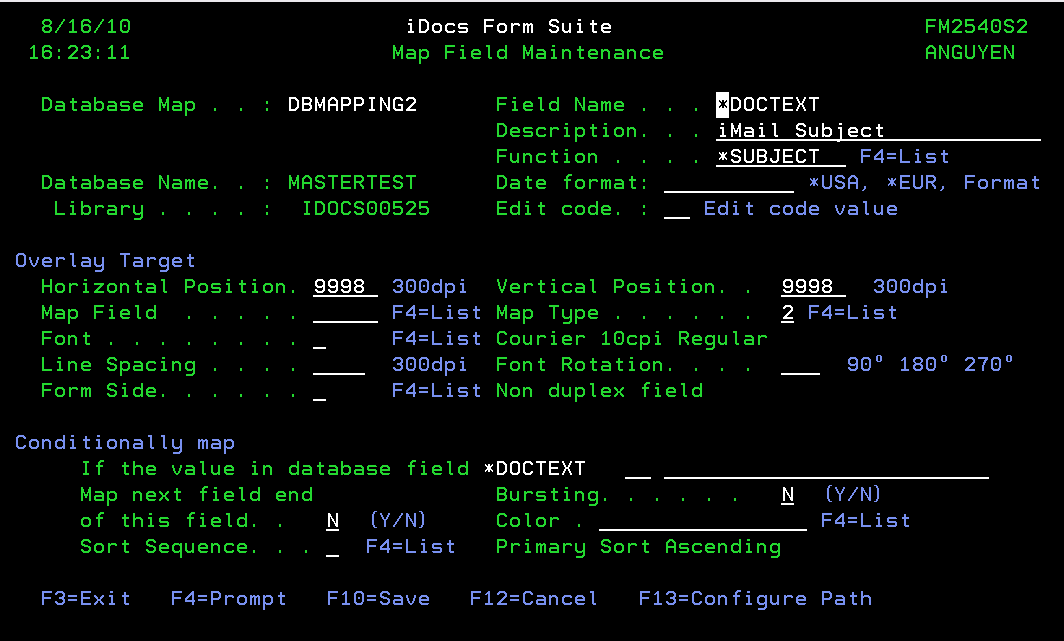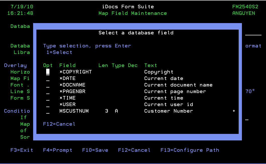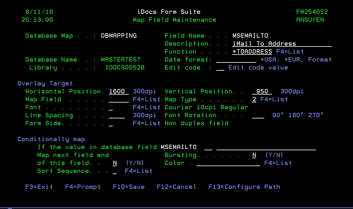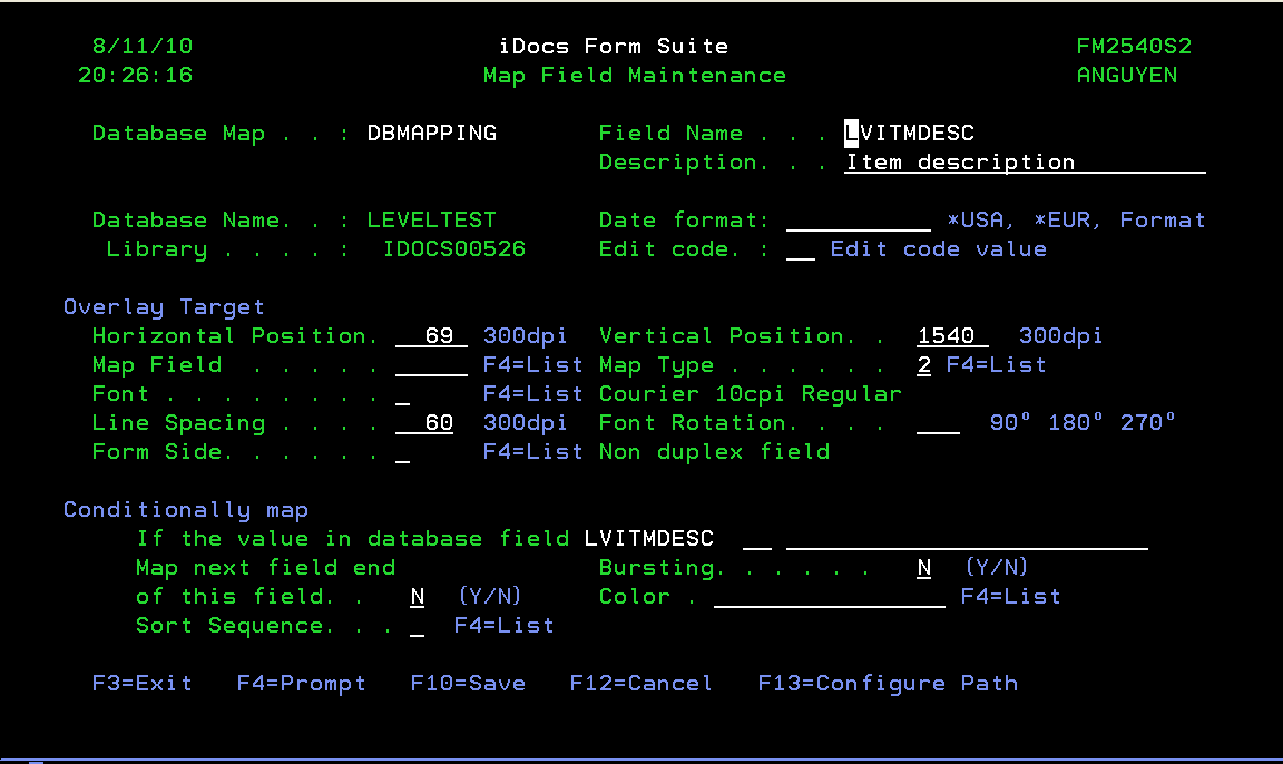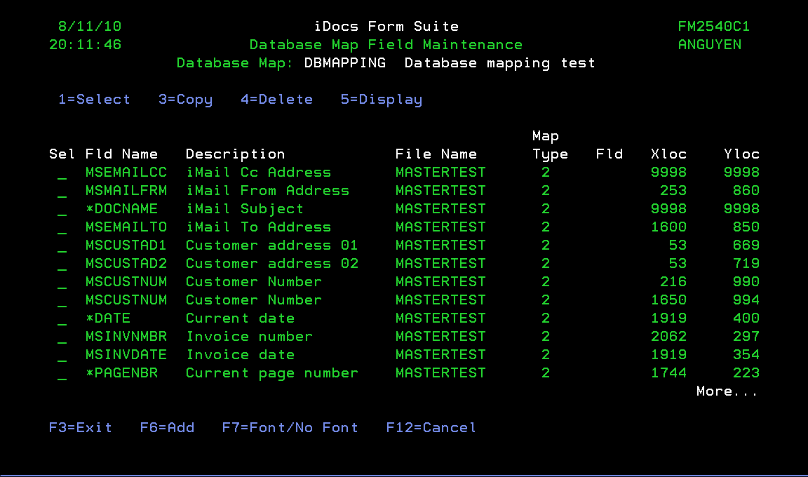 From the ‘Edit Database Map’ screen, select F8 to open the “Database Map Field Maintenance” screen.