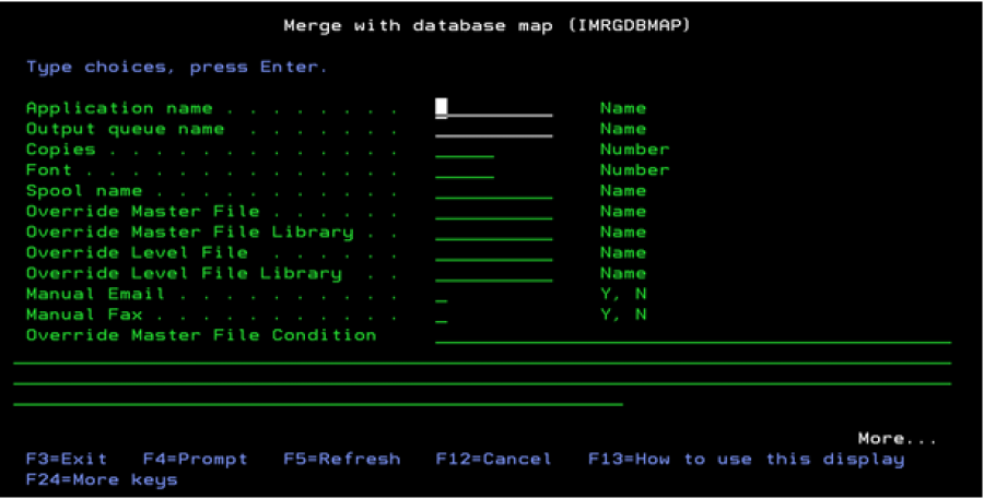 From the main menu of the ‘Work with …’ screen, select option 20 to merge an application with database mapping that is defined. This action is similar to ‘Merge with Spool Mapping’.