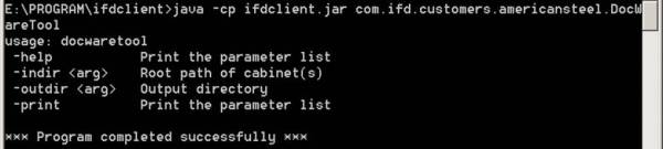 java -cp ifdclient.jar com.ifd.customers.americansteel.DocWareTool -indir <cabinet folder> -outdir <output folder which contains PDF/TIFF files>