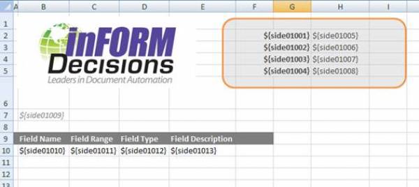The syntax for assigning of the Field Name I ${xxxx} in which xxxx equals the name of the Mapped Field Name. For example if the Mapped Field Name is SIDE01001 then you will want to use ${side01001} in your Excel sheet.