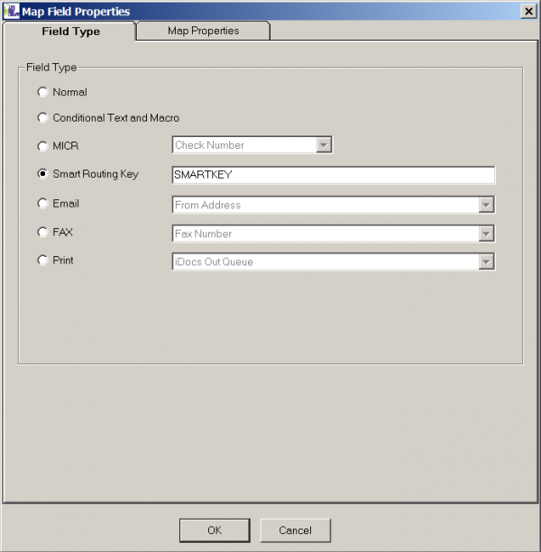 Just drag and drop spooled text to right panel to create a mapped field, go to window “Map Field Properties”, from the tab “Field Type”, just select option “Smart Routing Key”, enter the field Name, and click on button “OK” to apply your changes. Note that, this is also the way to create a mapped field that you want to manually enter your specified field name.
