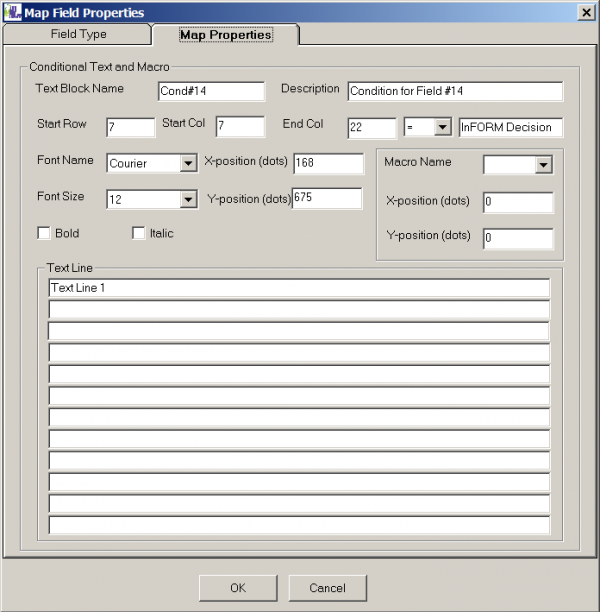 Just drag and drop spooled text to right panel to create a mapped field, go to window “Map Field Properties”, from the tab “Field Type”, just select option “Condition Text and Macro”, locate to the tab “Map Properties” to enter field values