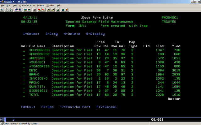 1. Select option 8 to review the list of mapped fields, for example, here is the list of fields of form application “INV1”