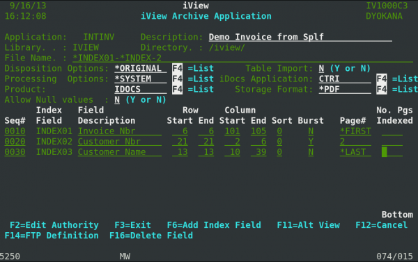 iDocs Application: If you want the spool file processed through iDocs before archiving specify the application here. If specified what is archived is a laser document, else it is a pdf document made from the text spool file. Product: Specify IDOCS to create a laser document using the iDocs Suite. Otherwise leave blank. This field is used for integrations with other document products. Storage Format: Specify the document type of the file. *PDF is the usual selection due to ease of use with a browser. PDF is also the front end default and any other selection may require front end configuration changes.