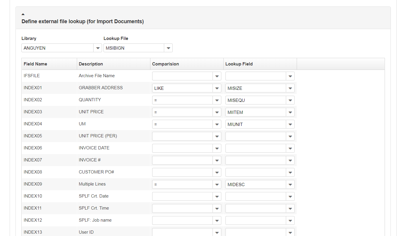 Define the library and name of the external lookup file, then for each INDEX field, define the mapping fields from external file as well as the Comparison type (= : exact match, <> : doesn’t match; LIKE : similar values)