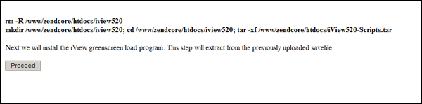 The first screen will list actions take to install the scripts, and any messages generated by the server. Click Proceed when ready.