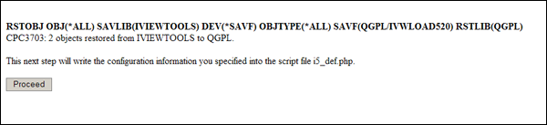 The second screen shows the command executed to restore the greenscreen load program into QGPL, as well as any system messages. When ready, click Proceed.