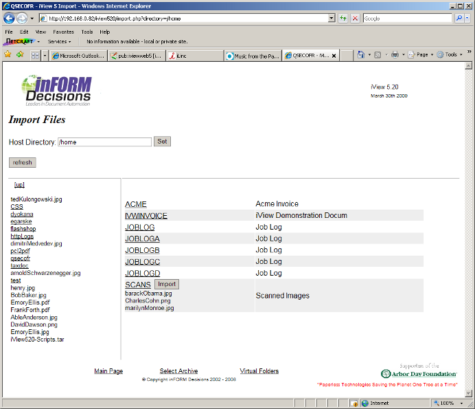 This page allows the admin to import scanned images into an iView archive. Using the dialog box at the top (which must be innitially set to an IFS directory by keying the directory and clicking 'set'), navigate to the IFS directory containing the scanned images. This directory can be networked. Then drag the image(s) to the correct archives and click the 'Import' button. Each image will be iteratively prompted for the index values and then imported into the archive.