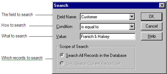 A condition describes how to look for information entered in the Value text box. For example, suppose you entered the words Franich & Halsey in the Value text box.