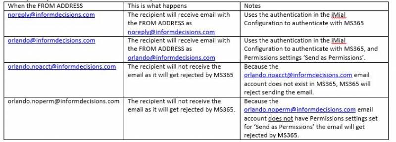 If the FROM ADDRESS configured in the iMail Configuration to authenticate equals noreply@informdecisions.com, and the permissions in MS365 for Send as Permissions have been configured, then outgoing email can use the noreply@informdecisions.com email account as the FROM ADDRESS or the individual user’s email account for example orlando@informdecisions.com. The recipient will receive the email with the FROM ADDRESS as the sender’s email account.